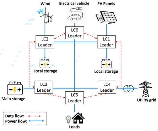 As depicted in Figure 3, each LC operates individually on managed energy sources, storage systems, and loads without central control. The control decisions are determined locally based on local measurements, which are shared among controllers using peer-to-peer communication.