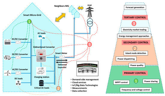 A good approach must consider the stochastic nature of different control parameters, the installation cost, the components lifetime, the distributed resources, and the reliable and safety operation of the MG system. In fact, the deployment of an EM control strategy requires the classification of the whole system into different levels, while each level should operate by coordinating with the other levels from the sources (e.g., maximum power point tracking) to the end consumers, which can be a local consumer or a neighboring MG consumer. Nowadays, smart components are installed for each source and for each MG system, which can cooperate between them due to the new ICTs. Especially, the actual inverters can execute different control strategies from the source power regulation to the interconnectivity to the utility grid or to the neighboring MG. In addition, the inverters can be installed for a large scale of MG systems, creating a cluster of data and electricity exchange, while these inverters could be connected to the internet in order to store the historic data in the cloud. Mainly, the main objective function for each inverter is ensuring continuous power supply to the consumers without considering the lifetime of the battery storage system or the cost of electricity. In this context, the development of an EM control strategy that considers the electricity price variation and minimizes the battery C/D cycle is required. These two issues allow the maximization of the system profitability by minimizing the electricity bill and avoiding a frequent replacement of battery storage in a MG system. The main idea is to develop an intelligent and predictive control strategy that can optimally control the distributed resources in the MG by considering multiple constraints and objective functions at the same time.