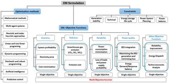 Like economic and pollution aspects, the term ‘reliability’ covers different aspects concerning the system operation cost, profitability, fails and maintenance, and productivity. Consequently, as mentioned above, RESs have a significant cost and consume a lot of energy in their fabrication. In order to maximize the profitability and system’s reliability, the production of these sources should be maximized. Therefore, the main aim is to maximize the use of renewable energy generation, minimizing the loss of energy, keeping the storage energy system at a good state of health, and ensuring a safety and efficient supply of energy to the loads. In this way, the authors of [54] presented an electricity market strategy for reliability enhancement of islanded multi-MG systems. A techno-economical objective function was deployed to account the profit of MG owners and to enhance the reliability of the system as well. Distribution functions were used for the probabilistic modeling of RESs and loads, and an electricity market strategy was proposed to improve the profit of the MG owners. However, the power quality, particularly the power loss, is still a main issue for the system’s reliability. Therefore, several works have proposed suitable EM methods and control techniques to minimize the power loss in MG systems. For instance, the authors of [55] integrated a MG with static synchronous compensator controller in order to ensure the higher power flow with enhanced voltage profile and reduced power loss. They concluded that the static synchronous compensator controller raises the capacity of the distribution line and contributes to voltage profile improvements and power loss reduction. Similar works have considered the concept of power loss minimization, such as those presented by the authors of [56,57,58]. Several objective function can be considered for the deployment of the EM strategies. The reliability improvement is a noticeable task in modern power systems due to its direct influence on the electricity price and more precisely social safety [59]. The auhors of [59] studied an approach for optimal operation of distribution networks. A hybrid algorithm (Grey-Wolf Optimizer and Particle Swarm Optimization) was proposed to solve the proposed multi-objective function. The results were compared with those presented in literature works to demonstrate the powerful of the proposed algorithm. A beneficial literature work for multi-objective EM was improved by the authors of [60], who studied a multi-objective EM in an MG system. Techno-economic analysis and energy dispatch were presented for standalone and grid-connected MG infrastructure with hybrid RESs and storage devices.