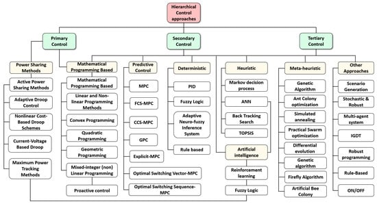 Therefore, the deployment of an energy management approach should be able to enhance the dynamic response of distributed energy resources under different operating conditions and maximize the usage of RES power generation while ensuring the stability when one or more sources are connected or disconnected into/from the system. In this way, different approaches from literature have been proposed for EM (Table 2). As shown in Table 2, the most suitable control strategies could be selected according to fixed constraints and objective functions. These control strategies can be classified into three main categories: Centralized, decentralized, and hierarchal control, as mentioned in Figure 1. These control strategies are presented in the rest of this section.