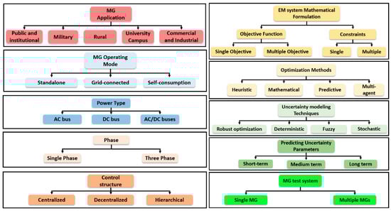 The deployment of more than one energy source in MG systems requires the use of efficient control strategies/approaches for managing energy flow. This requires the development and deployment of EM systems. EM systems should be able to effectively coordinate energy sharing and trading among all electrical networks while supplying loads according to the operational conditions and economic constraints with secure, reliable, and efficient power system operation. In fact, optimization techniques for D/R, demand-side management, and power quality management are needed to achieve different EM system objectives while satisfying multiple constraints, such as electricity price minimization and occupants’ comfort maximization, as mentioned in Figure 6.