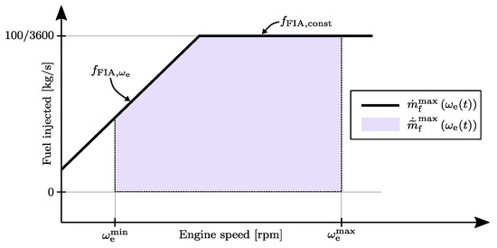 The reformulation (12) is schematically drawn in Figure 4 and can be interpreted as follows: if the engine speed is below the maximum amount of fuel that can be injected is constrained by the engine-speed dependent ramp ; if the engine speed is above , the maximum amount of fuel is limited by the constant constraint .