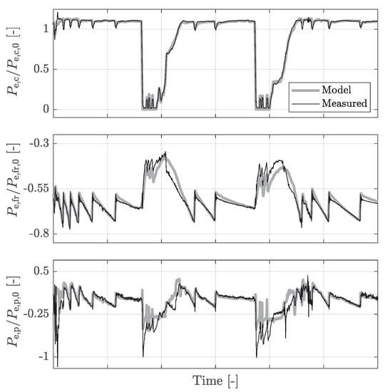 where is the exhaust manifold pressure and is a coefficient subject to identification. Figure 5 shows the fitting of the engine combustion, friction and pumping power. Whilst all three power contributions match precisely the measurements data on the straights, the friction and pumping powers partially differ during the corners, i.e., where the engine is not operated at full load. Regarding the friction power, this might be attributable to the simple model which lacks additional (input or state) dependencies, whilst the difference in the pumping power might be due to physical phenomena that zero-dimensional models are not able to capture properly.