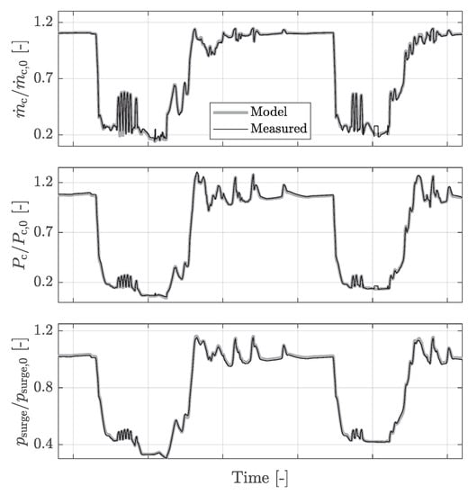 Measured and modeled compressor mass flow (), compressor power () and compressor surge ().