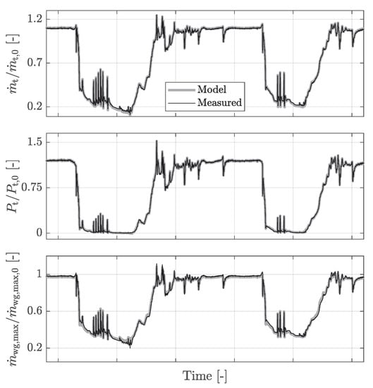 Measured and modeled turbine mass flow (), turbine power () and maximum waste-gate mass flow ().