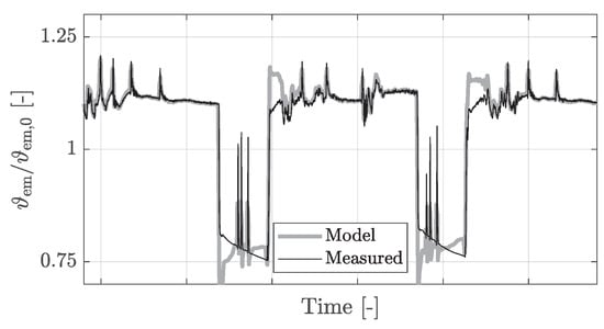 where and are coefficients subject to identification. The model (37) captures that the engine-out temperature is colder for a higher engine air-mass flow. Figure 8 shows the comparison of the exhaust manifold temperature model to measurement data. The proposed model properly captures the behavior on the straights where the temperature is high, especially during the upshifts (recognizable as little peaks), whereas it overestimates the temperature in the last part of the corner. This might be attributable to the quasi-static modeling choice, which entails the absence of the receiver’s inertia.