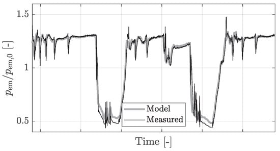 where N is the number of data points considered, is the modeled value and is the measured one. The data displayed in the Figures 3, 5–10 are telemetry data acquired during a race week-end on a current F1 hybrid electric race car by our industrial partner. For confidentiality reasons, we are not allowed to disclose the exact experimental setup used to obtain them, i.e., sensor specification and placement. The majority of the data are acquired directly by means of sensors, e.g., intake manifold pressure, or are computed online by means of maps that were recorded on dedicated test-benches, e.g., compressor and turbine mass flow maps. Finally, all the validation plots shown in the following sections cover roughly a third of the racetrack and include three straights and two corners.