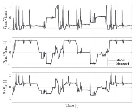Measured and modeled MGU-K electrical power (), MGU-H electrical power () and battery internal power ().