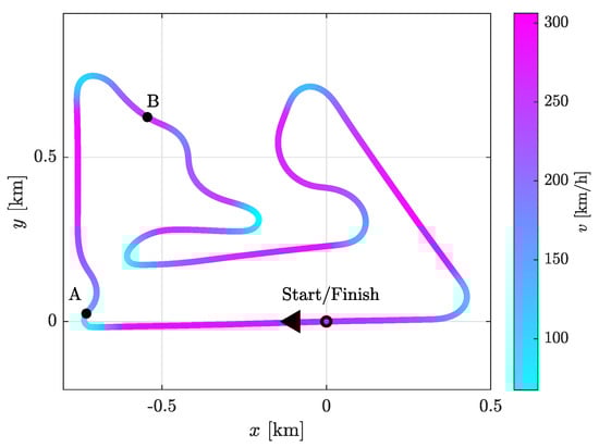 Track layout of the Bahrain International Circuit with a color-coded representation of the F1 car velocity measured during a race week-end. This specific racetrack layout is used in Section 4 for the results and case studies. The points A and B mark the beginning and end of the track segment investigated in Section 4.