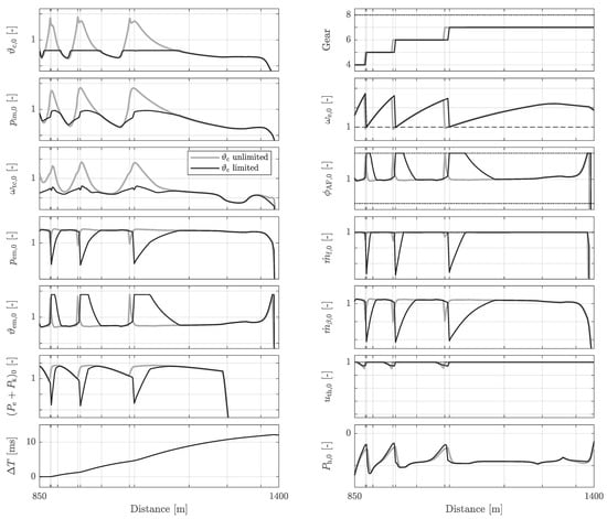 where , , , , and are the initial and terminal conditions for the velocity of the car, the intake manifold pressure and the turbocharger kinetic energy, respectively. For periodic paths (e.g., entire lap optimizations where the start and finish line coincide), the last six constraints of Equation (A7) can be rewritten as periodicity conditions, i.e.,