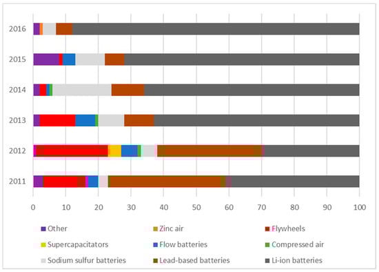 Technology mix in storage installations excluding pumped hydro from 2011 to 2016. Redrawn from [28].
