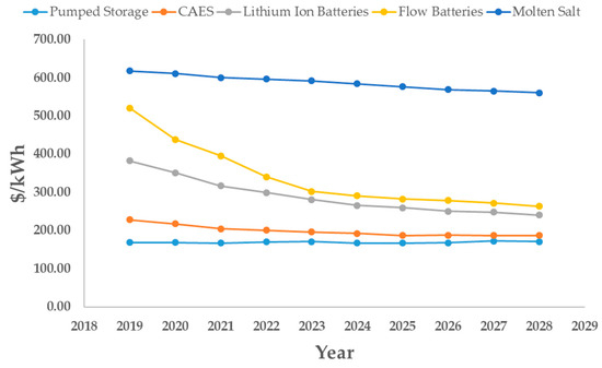 - Schmidt, O.; Melchior, S.; Hawkes, A.; Staffell, I. Projecting the Future Levelized Cost of Electricity Storage Technologies. Joule 2019, 3, 81–100. [Google Scholar] [CrossRef]