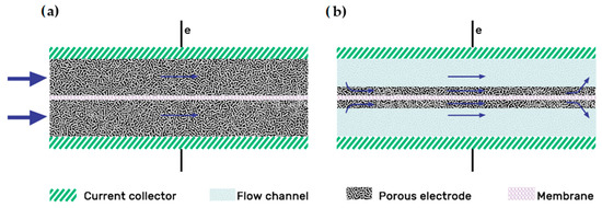 There are two main electrode designs: the “flow-through”(FT) and the “flow-by”(FB) configuration, as illustrated in Figure 6 [32].