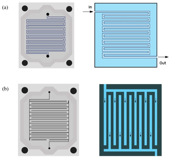 Flow channel designs: (a) Serpentine flow field; (b) Interdigitated flow field configuration. Redrawn from [20].