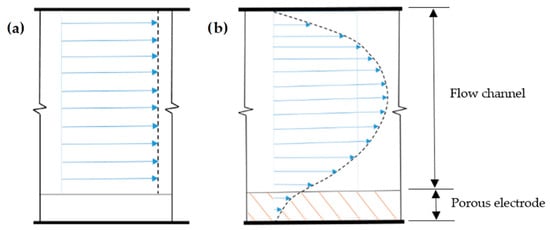 Electrolyte flow distribution: (a) Flow field distribution at the entrance of the flow channel; (b) an intermediate point, where the flow penetrates into the porous electrode. Redrawn from [32].
