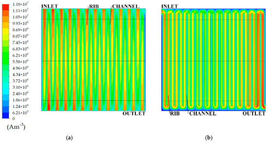 Adding a flow field increases the crossover rate of the vanadium ions due to the strong convection effect, which slightly lowers the Coulombic Efficiency. However, the uniform distribution of the electrolyte that provides the flow field decreases the polarization, improving the voltage efficiency while the overall efficiency is also enhanced [71]. Jiang et al. [104], using a 3D numerical simulation, slightly sacrificed the Coulombic Efficiency with a high conductivity membrane in order to achieve higher Voltage Efficiency. This membrane combined with a uniform distribution of the electrolyte provided by the interdigitated flow field, allowed them to reach an outstanding energy efficiency of 80.83% and a high stability of operation during the time at high current densities (600 mA/cm2). Flow distributions are extremely difficult to be measured directly through experimental methods; therefore, optical measurements and numerical studies are an effective approach to simulate the flow transport [105]. The most common CFD model is the three-dimensional, because it considers the electrolyte movements under the ribs and the flow channels (see Figure 8), which are relevant factors as an important number of the reactions occur within the porous electrode, and the overpotential depends on the distribution in both the in-plane and through-plane directions [71]. On the other hand, 2D models are commonly used to study the flow distribution from the top view of the flow field scheme, as the work carried out by Yaji et al. [106], who studied the optimized flow field distribution and obtained a “branched” interdigitated model. However, there are also some researchers, as Ishitobi et al. [107], that studied the velocity, concentration of reactants, and overpotential at different SoCs from a side-view of the stack. Furthermore, this model has been also used in some heat transference studies along the stack, reporting the importance of the temperature at the outlet caused by the heat (of the exothermic reactions) transfer of the electrolyte out of the stack [94,108].