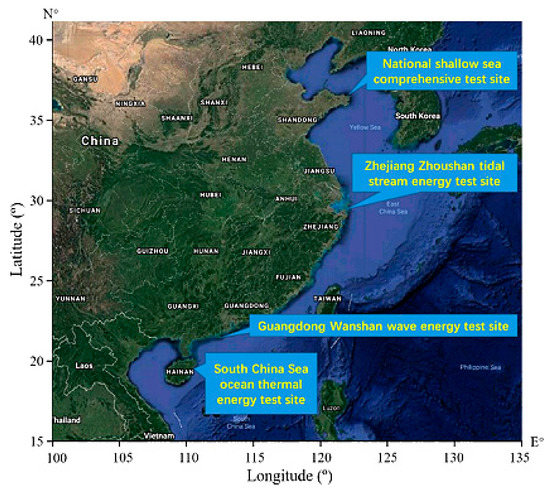 The State Oceanic Administration conducted a recent study, which showed that the oceanic renewable energy reserves in China reach approximately of which the usable reserves reaches [19,20,21]. Figure 1 shows the percentages of tidal, wave, ocean current, osmotic and temperature difference energy sources [4,22]. The energy flow density is high on the eastern coast of the Shandong Peninsula, near the remote islands of Mount Penglai located in the eastern part of the city of Rongcheng, along China’s southeast coast and in the middle of the Bohai Sea. These four locations are ideal areas for wave energy development [23,24,25]. The energy flow density reaches on the eastern coast of Chengshantou, Weihai, and can be classified as a Class One Rich Energy Area. The north coast of Weihai is the construction site of the first national offshore wave energy and current energy experimental site. These coasts are suitable for developing small- and middle-scale wave energy generators and power supply units [11,26]. In 2020, our ocean energy core equipment began to generate of power. Therefore, China has proposed five basic tasks to lay the foundation for developing ocean-sourced energy, including combining ocean construction with “the Belt and Road” project, which are as follows: increasing public support of ocean energy development; completing the construction of the ocean energy demonstration bases in Shandong, Zhejiang, Guangdong and Hainan (Figure 2) [27]; constructing a separate power system to extract island/reef ocean energy; and constructing million-kilowatt tidal energy power plants in Zhejiang and Fujian [28,29].