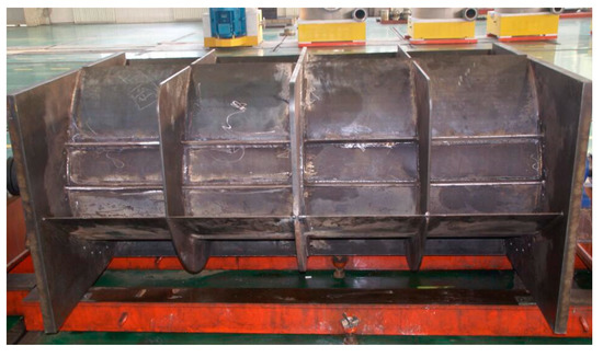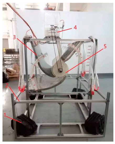 The physical experiment is conducted in the National Engineering Laboratory of the NMEI Group Co., Ltd. (Qingdao, China). The experimental water tank is 30 m long, 4 m wide and 3 m high; the experimental model is 1.1 m long, 1 m wide and 1.8 m high. The model is installed 10 m away from the wave generator by a vehicle lift. It is fixed with a heavy block; the model prototype is shown in Figure 7. The model consists of five parts: 1. the clump weight, which is used to stabilize the generator and prevent it from moving under the impact of the waves; 2. the base support, which measures 1.4 m long, 1.4 m wide and 0.6 m high and increases the contact area between the model and the base of the water tank to stabilize the model; 3. the variable-angle fluid channel, which is designed to change the size of the water’s entrance and exit points; 4. the power generator, which consists of a generator, a torque sensor, a motor bracket, a concentric coordinate, a bearing and a synchronous belt that measures the torque and rotating speed of the horizontal axis rotor under wave conditions; 5. the horizontal axis rotor, which is the main component of the generator and can convert wave energy into mechanical energy and pass it to the torque sensor and generator through the synchronous belt.