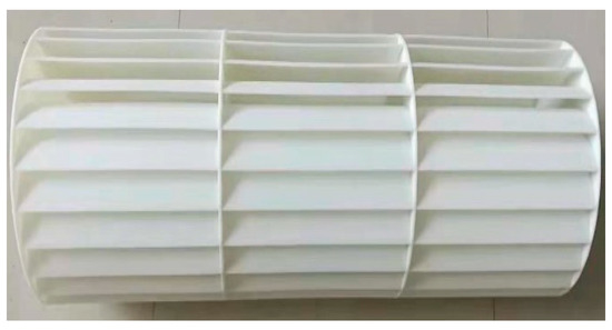 Most wave energy converters convert energy through the application of hydraulic mechanisms. However, this paper is focused on direct drive wave energy converters. It does not discuss the energy conversion in the intermediate stage and introduces a new methodology. To meet the power demand on China’s coast and remote islands, as well as that of marine ranching, and utilize ocean energy more effectively, a new horizontal axis rotor wave energy direct drive generator has been designed. Its installed capacity is 6 kW, and it weighs 28 tons and measures 6 m long, 6 m wide and 5.4 m high. In addition, an engineering model has also been developed, as shown in Figure 3 [43]. The horizontal axis rotor is the core part of power generation with the diameter being 625 mm and length being 2000 mm. Thirty involute blades are distributed on the circumference evenly, as is shown in Figure 4. The exact dimensions of the engineering prototype and model prototype are shown in Table 2.