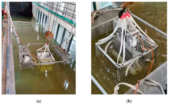 Water tank experimental setup of model prototype: (a) Hoisting; (b) Model experiment.