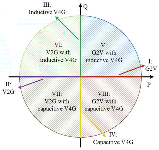 According to the power flow direction, the types of EV chargers can be summarized as: unidirectional/bidirectional with on-/off-board chargers []. The active and reactive power (PQ) coordinate in Figure 1 shows the full control region for EV battery chargers. The positive directions of P and Q represent the power being delivered from the grid to the EVs. According to the direction of active and reactive power transmission, the PQ plane can be divided into eight operation modes. The xy axes of the PQ frame, defined as Modes I–IV, represent the pure G2V, inductive V4G, V2G, and capacitive V4G operations, respectively. The other four quadrants show the V2G or G2V operation along with the capacitive or inductive V4G operation.