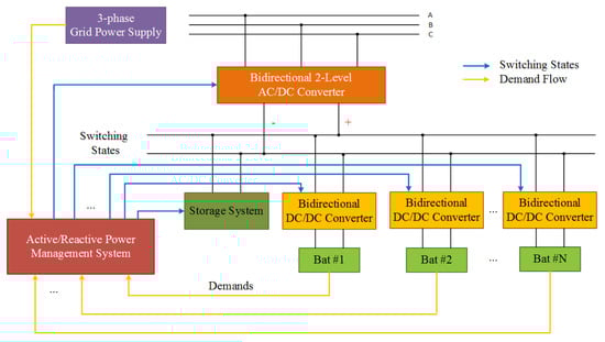With the integration of EVs, car parks located in workplaces or shopping malls show enormous potential for getting EVs involved in the grid. To exploit this commercial potential, a smart car park where large populations of EVs would be parked was proposed in a previous work []. The proposed smart car park system consists of bidirectional charging stations, a control center, and energy storage devices, as presented in Figure 3. The active/reactive power management system can be regarded as a central controller. The power demands from the EVs and storage system (such as a supercapacitor/flywheel) are sent to this central controller. Optimal control strategies are applied to generate the control signals. The switching states are transferred to drive the relevant converters or devices.