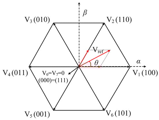 Assuming that the reference voltage is located in sector 1 of the vector diagram presented in Figure 5, based on the parallelogram law, it can be obtained from the two closest voltage vectors ( and ), expressed as