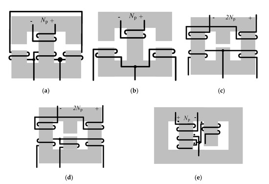 - Zhou, H.; Wu, T.X.; Batarseh, I.; Ngo, K.D. Comparative investigation on different topologies of integrated magnetic structures for current-doubler rectifier. In Proceedings of the 2007 IEEE Power Electronics Specialists Conference, Orlando, FL, USA, 17–21 June 2007; IEEE: Piscataway, NJ, USA, 2007; pp. 337–342. [Google Scholar]