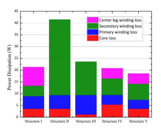 For a power output of 1.2 kW, Figure 2 illustrates the total losses of five transformer structures in the same output inductance condition. Among Structures I–IV, Structures I and II exhibit relatively low self-inductance on the primary side and thus larger current ripples on the primary side. In addition, because interleaved winding cannot be used to reduce the amplitude of the magnetomotive force in winding layers for Structure II, it has the highest conduction loss among the first four structures. The winding method in Structure III alleviates the problem observed in Structure II but requires more turns to achieve high output inductance, which contributes to the additional conduction loss in Structure III. Structure IV increases the number of windings to facilitate a flexible output inductance design. Although it yields lower total loss than the first three structures do, it exhibits a high level of conduction loss. Structure V, compared with the other four structures, has relatively high primary-side self-inductance and, thus, smaller current ripple, reducing the AC conduction loss through the interleaved windings; in addition, Structure V facilitates flexible inductor design because of its additional winding and, due to its low magnetic flux density, has a lower hysteresis loss compared with Structure IV. Analysis of and comparison among the five magnetic components reveals that the lowest loss is in Structure V.