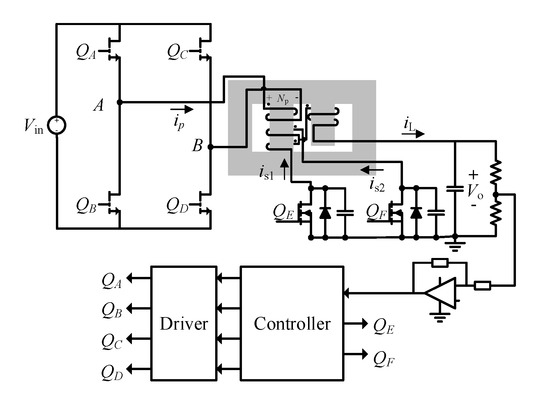 For a phase-shifted full-bridge converter [4,5,6,7,8], the switch on the primary side does not achieve full-range ZVS, and the synchronous rectifier on the secondary side exhibits high switch stress. However, the converter structure features an output inductor, which reduces the number of output capacitors. In addition, the ZVS on the primary side of the converter and switching current that exhibits an approximately square wave on the secondary side effectively reduce the primary and secondary-side currents; this reduces the switch conduction loss and thus facilitates high efficiency for applications in high-wattage devices. When this structure is used in devices with a high-current output, a center-tap or current-doubler rectifier is typically adopted for rectification on the secondary side of a transformer. Compared with a center-tap structure, a current-doubler structure reduces the conduction loss in the secondary winding of a transformer by half. In a circuit, a magnetic component comprises a transformer and two output inductors, which increases the volume of the circuit. As the number of magnetic components increases, the number of joints in the circuit design also increases; therefore, when a large current is present, integration between windings and circuit components reduces the conduction loss and contact loss.
