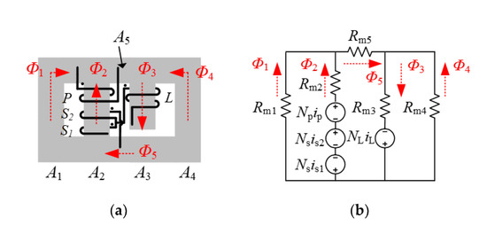 Figure 4a depicts the side view of the magnetic component on which parameters are marked, and Figure 4b presents the equivalent magnetic path model. Each of A1–A5 represents the effective cross-sectional area of a magnetic leg; Rm1–Rm5 represent the reluctance corresponding to each of the respective magnetic legs, and Rm5 is the reluctance between the transformer and inductor, which affects the coupling effect of the two and thus greatly influences the overall magnetic path analysis. To simplify the production and design of a magnetic core, the outer legs are usually designed symmetrically, and the effective cross-sectional area is designed to be half the cross-sectional area of the second leg to satisfy Rm1 = Rm4 = Rm and Rm2 = 0.5Rm. Φ1–Φ5 is the magnetic flux in each leg. The transformer and output inductor windings are wound around the second and third legs, which correspond to A2 and A3, respectively; magnetomotive force is represented by voltage source symbols; Np refers to the number of turns in the converter primary winding P; NS is the number of turns in each of the secondary windings, S1 and S2; and NL is the number of turns in the inductor winding L.
