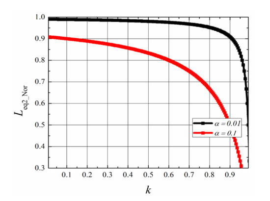 Because k and α are both positive, according to Equations (14)–(19), the smaller α is, the closer the inductance values from after integration and before integration are in each interval. When α = 0, the inductance in each interval is identical before and after integration. This result is also verified with the sensitivity curves of Leq2,Nor in relation to k and α (Figure 8).