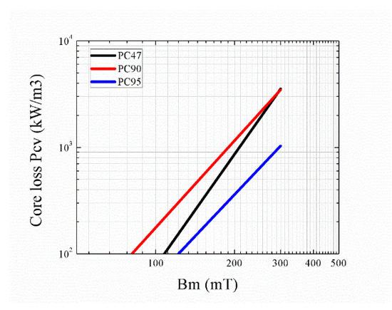 where ΔΦy is the magnetic flux variation in each leg; this variation can be calculated according to the magnetic density variation with a given loss, which is determined using the curve for ferrite core loss volume density (Pcv) against magnetic flux density (By_max; Figure 11). Whichever of Equations (27) and (28) has the greater value is determined as Ay.