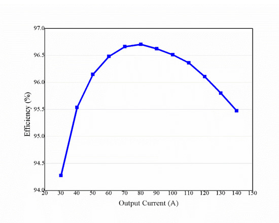 Figure 15 depicts the experimental efficiency of the novel phase-shifted full-bridge converter with an integrated transformer; the curve peaks at 96.7% in the half-load condition. Although wide band gap components greatly reduced the hard switching loss in the light-load condition, switching loss and ferrite core hysteresis loss remained the main sources of loss in the light-load condition. The integrated ferrite core reduced the distance between the center tap and the inductor contact, which reduced loss along the path in the half-to-full-load condition.