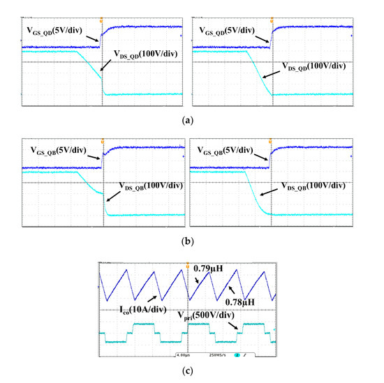 Figure 17a depicts the switching waveforms of the leading bridge arm switch in various load conditions. When the output load was greater than 45 A, the leading bridge arm switch achieved ZVS, and no Miller plateau was observed in the switch gate voltage. Figure 17b reveals the switching waveforms of the lagging bridge arm switch in various load conditions. As seen in Figure 17a, hard switching was implemented; to improve efficiency, the dead time was designed to occur between the switch series resonance and the wave trough to reduce the loss incurred from hard switching. When the load current was greater than 80 A, the lagging bridge arm switch achieved ZVS, and no Miller plateau was observed in the switch gate voltage. Figure 17c presents the waveforms of the novel converter with an integrated transformer in the full-load condition. A measurement of the current ripples in the output inductor revealed waveforms similar to the analysis result proposed in Section II. The actual equivalent inductance was determined from the slope of the current.
