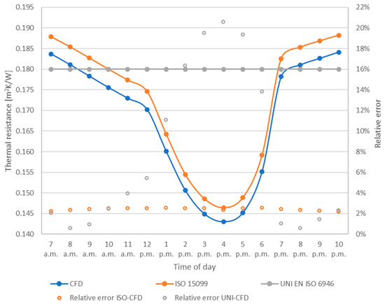 Comparison between the hourly thermal resistance values for the closed cavity provided by the CFD simulations and following the ISO 15099 and UNI EN ISO 6946 calculation procedures. The graph shows also the RE of the CFD results compared with the standards at each hour.
