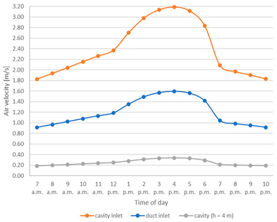 Hourly air velocity values referred to: duct inlet section, cavity inlet section (at the bottom of the façade), cross section of the cavity at a height of 4 m.