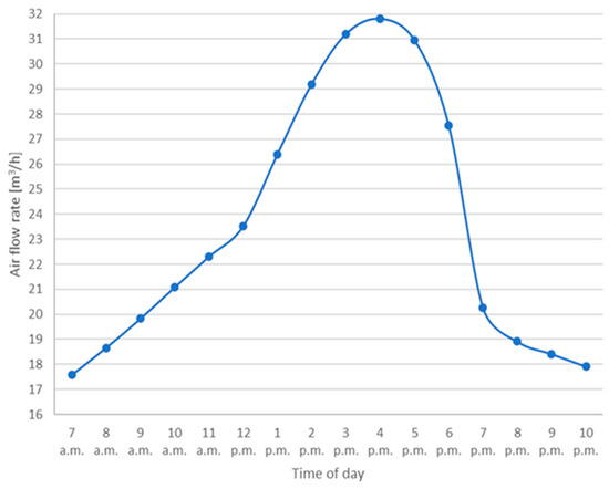 Figure 6 and Figure 7 display how the air velocity and flow rate reflect the sol–air temperature profile, with a faster growth and the maximum peak in the hottest hours, and a semi-linear profile before 12:00 a.m. and after 7:00 p.m. This trend is related to the solar radiation, which significantly affects the temperature of the concrete slab, heating up the air in the cavity and then increasing the ventilation flow rate.