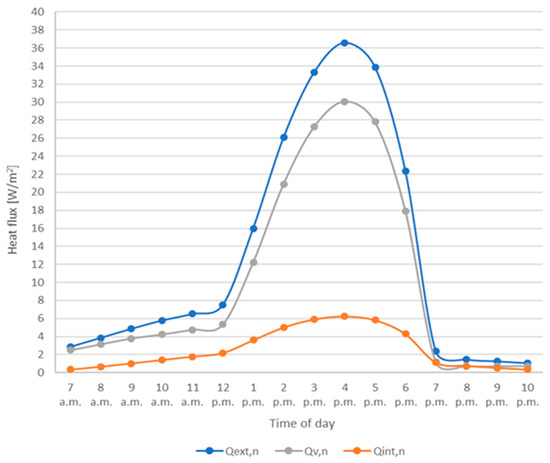 Hourly heat flux profiles obtained using the naturally ventilated façade: Qext,n is the heat flux coming from the external environment into the cavity, Qv,n is the one removed by ventilation, and Qint,n is the heat flux that flows from the cavity to the internal environment.