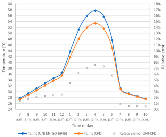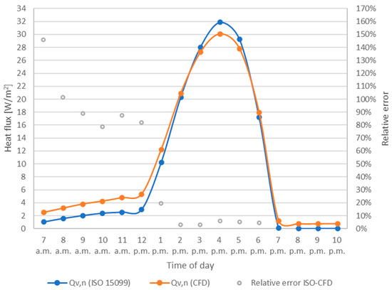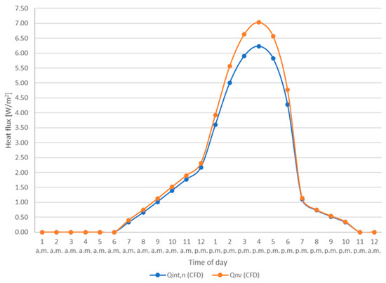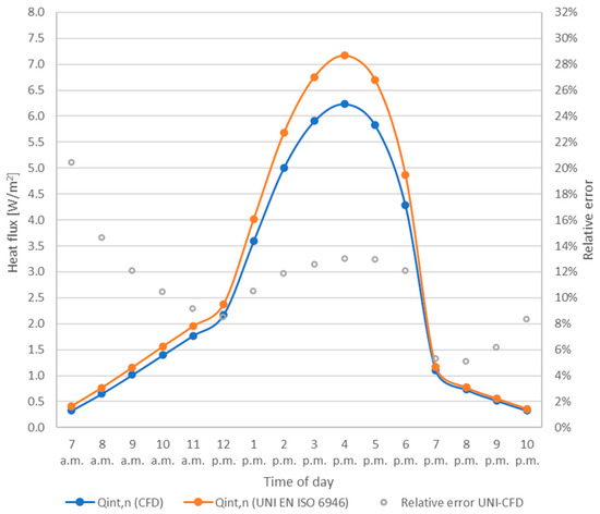 As previously done in the case of closed cavity, the results obtained were compared with those provided by the Standards UNI EN ISO 6946 and ISO 15099. First of all, the heat flux Qint,n obtained from the CFD analysis was compared with the one obtained following the simplified calculation method proposed by UNI EN ISO 6946 for well-ventilated air layers [29], which requires the calculation of the ventilated façade thermal transmittance (described in Table A5 Appendix A). The values obtained show a good level of agreement, with a maximum difference of about 1 W/m2 at 4 p.m., as it can be seen in Figure 10, and a MRE of CFD with respect to the standard equal to 11%. The increasing difference between the values calculated during the hottest hours of the day is due to the simplified method assumptions: the standard considers the presence of the ventilated cavity exclusively using a fictitious thermal resistance value (0.130 m2K/W) constant over the day, thus neglecting the increase in the ventilation efficiency and in the heat flux removal during the afternoon hours, considered by CFD instead.