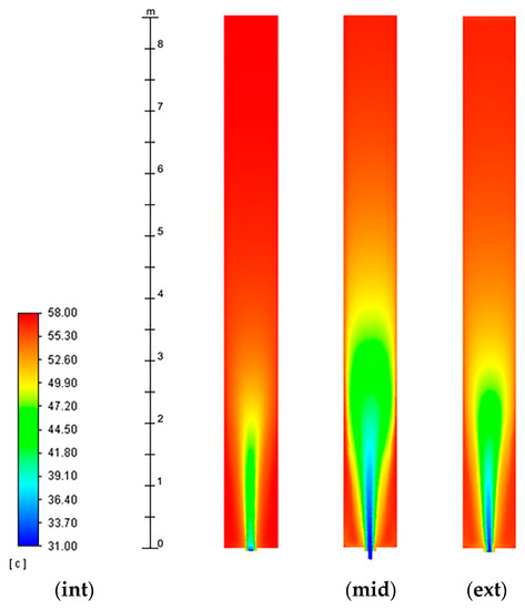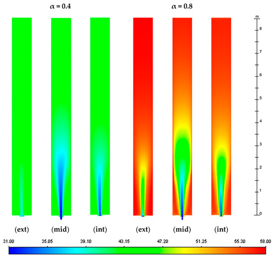In this section, a comprehensive analysis of thermo-fluid dynamic behavior of the façade with no ventilation (closed cavity), natural ventilation and forced ventilation into the cavity through CFD approach and comparison with international standard procedures is reported. Furthermore, a sensitivity analysis varying the solar absorption coefficient (α) is performed. Initially, it is assumed equal to 0.8 concerning a 15-h time slot, from 7:00 a.m. to 10:00 p.m., when the external temperature is higher than the internal one, resulting in a positive heat flux entering the building. The sensitivity analysis considers halved value, α = 0.4 (for the cases with ventilated cavity only), instead, for only 4 h, when the incident solar radiation is the highest and the influence of the absorption coefficient is the most relevant. All the simulations performed are listed in Table 2.