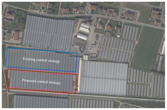 The methodology presented above was implemented in a real commercial greenhouse. The experimental tests were conducted for 80 days in winter time. The experimental facility was a multi-span plastic greenhouse for the cultivation of tomatoes throughout the year, located in the North Italy (Mantua region, latitude ). The entire facility was , of which were equipped by artificial lights. The greenhouse equipped with an artificial lighting system was divided in two parts of similar size of each, as shown in Figure 1. The one implementing the existing controller was used as a benchmark, and the other one was used to test the proposed controller.