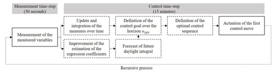 At each control time step, the proposed controller updates the current measures in order to calculate the integral of past values and improve the estimation of the regression coefficients to forecast the daylight radiation filtering into the greenhouse. On the basis of this data, the algorithm re-defines the required control goal, , defined in Equation (6), and subsequently defines the control sequence that optimizes the energy costs. Similarly to the MPC approach, the controller actuates only the first control move and the procedure is repeated according to a receding horizon scheme. The novel algorithm computational steps are pinpointed in Figure 3. Moreover, Figure 4 provides a framework of the variables (measured or regulated) used by the algorithm.