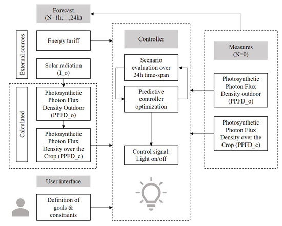 The only assumption of the present work is considering that the end-user is able to completely benefit from the energy price fluctuation over the wholesale market. Indeed, the wholesale energy price is not the unique component of the energy tariff payed by the end user. The end user tariff includes also additional voices, such as dispatch, taxes, and utilities revenues. However, the wholesale energy price is the component mostly affected by the sharp daily fluctuation of energy availability due to RES penetration. The wholesale market price is a good indicator of the grid unbalances between offer and demand [54]. For this reason, authors limited their benchmark studies to this unique price voice. Measurements were retrieved every 30 s. The control time-step was set equal to 15 min. This means that, every 15-min interval, the algorithm repeats the sequence described in Figure 3. The prediction and control horizon were set equal to 1 day, and at midnight the integral values were reset to 0. The combination of control time-step and prediction horizon length causes the maximum value of n in Equation (11) to be equal to 96, limiting the computational effort of the algorithm. The control goal was set using a daily objective of cumulative . Considering that the experimental campaign was undertaken during the winter season, this value represented a challenging threshold. For the sake of comparison, readers can refer to the outdoor horizontal solar DLI of the location considered. During the experimental campaign period, the daily outdoor DLI ranged between and . When the natural DLI was not sufficient, the artificial lighting system had to integrate the radiation reaching the canopy for boosting crop growth and maintaining the selected set-point.