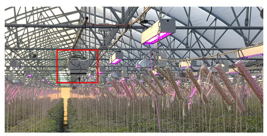 Sensors installed inside the greenhouse with the electrical cabinet containing the data monitoring unit hanged to the greenhouse cover.