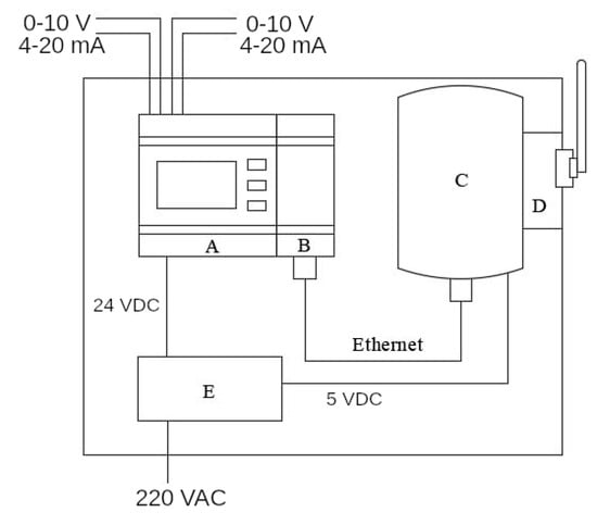 Schematic of the monitoring unit. (A) Industruino IND I/O 1286; (B) Industruino Ethernet module; (C) Raspberry PI Model 3; (D) GPRS unit; (E) power supply. The two 4–20 mA connections acquire the data from the indoor and outdoor pyranometers; the two 0–10 V connections acquire the data from the indoor and outdoor Photosynthetic Active Radiation (PAR)-meters.