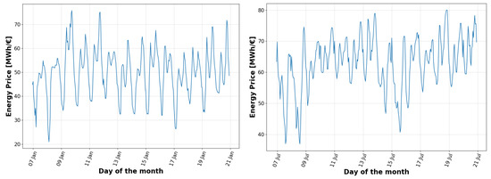 Two external forecasting resources were integrated in the predictive controller. The first one was the day-ahead energy price forecast at the wholesale Italian market [52]. Indeed, the Italian grid regulator (named GME) provides the electric wholesale tariffs of the day-ahead with a sampling time of . Figure 7 shows how the unbalances due to the large penetration of RES caused a great electrical tariff fluctuation over time. The charts show two different weeks. One is characteristic of the winter period, when the experimental tests were undertaken. The other represents a typical summer week, the period of the year when the energy price fluctuation are more significant.