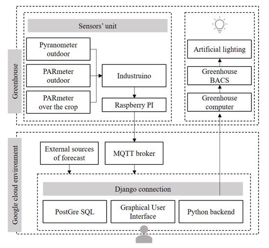 The lighting system was based on LED Igrox Quantum with a nominal lighting efficiency of and an installed power density of . The overall power supply to the artificial lighting system was distributed over 24 electrical lines at . Artificial lighting were not dimmerable so that the control variable of Equation (8) outlines the schematics of the monitoring and supervisory control units used for this experiment.
