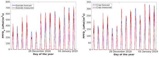 Then, Equation (6) underlines that the feedback of the controller should be based on the DLI over the canopy. However, the variable used in Equation (7) is measured outside the commercial greenhouse cover. This is due to the fact that the shadows of greenhouse construction elements (e.g., vents frames, pillars, and trays) may affect instantaneous measurements, which are used mostly for regulating the fertigation of the crop. The relation between and is defined arbitrarily, with the support of spot measurements, generally repeated during every season (). In this existing control strategy, is measured with a portable PAR-meter and correlated with the measured outside by the Building Automation and Control System (BACS) of the commercial greenhouse. This trivial system may be improved. A method capable of forecasting over the prediction horizon should be developed to implement an effective predictive controller.