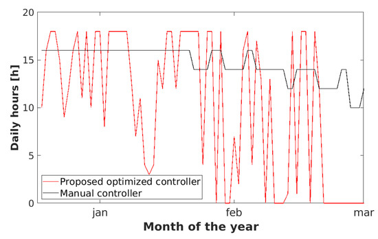 This control logic is affected by two primary drawbacks. First, Equation (6) outlines how the controller goal is based on the integral of a measure. A feed-back controller is intrinsically affected by limitations when it deals with integral measures in the control loop. Contrariwise, this case represents the ideal application for a predictive controller capable to set optimal regulation strategies. Indeed, evaluating the control trajectory over a prediction horizon enables the regulation to exploit potential favorable situations occurring in the future. For example, if the lowest energy tariff would occur at the end of the day, a predictive controller can postpone the artificial lighting period to wait for that moment. The predictive controller is capable of evaluating and forecasting in advance all the disturbances affecting the optimal trajectory to reach the control goal pinpointed by Equation (6) (i.e., and the energy price/availability).